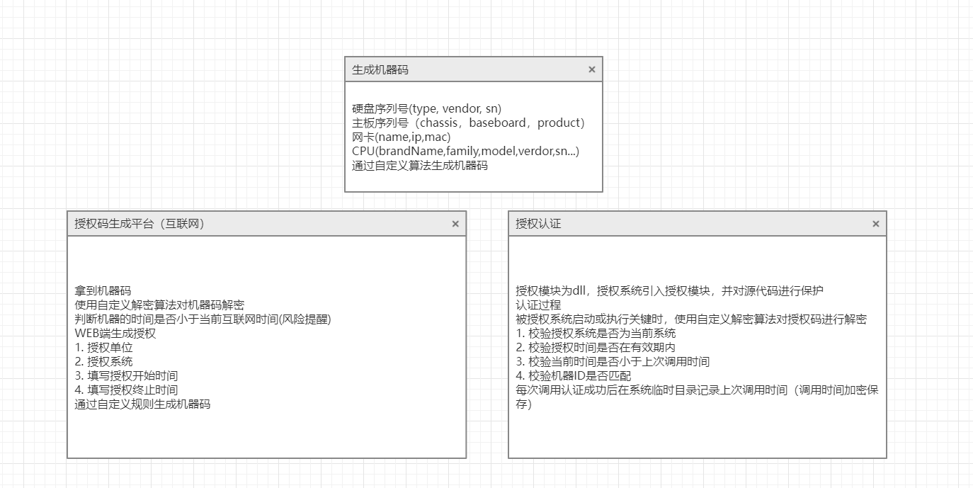 模块为so/dll文件 该模块集成到被授权系统,在系统启动时和关键步骤进行授权认证